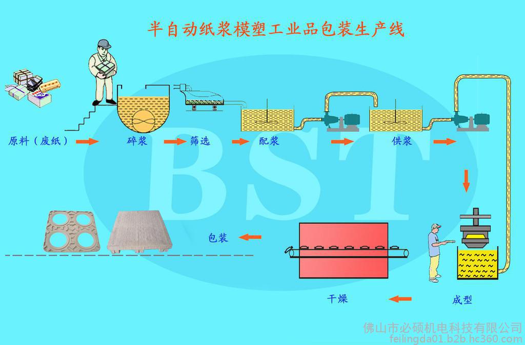 1.制浆系统:将旧报纸**、纸箱等废纸,经过碎解、筛选、添加化学助剂等工艺调配成一定浓度的浆料,供成型使用。主要设备有:碎浆机、浆桶、水桶、浆泵、水泵、搅拌器、浓度控制仪、控制柜等。