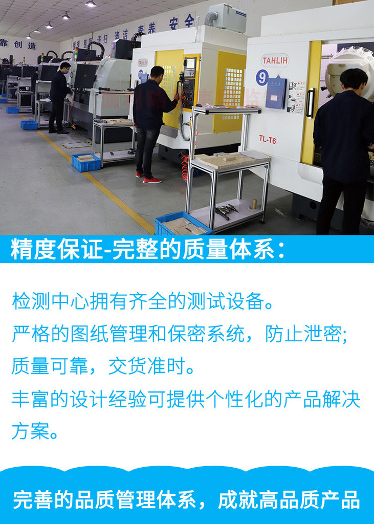 服务项目 手板制作、CNC加工、3D打印、零件加工、批量生产、检测治具等 服务特色 技术创新,复杂高难度样件加工,加工速度快,精度高,质量有保障、产品保密制度,一对一服务,性价比高 应用领域 汽摩配件、照明灯饰、自动化机器人、机械五金、航天军工、电子仪器、 医疗器械、3C数码、家用电器、通讯手机等 加工工艺 CNC加工、3D打印、快速成型SLA/SLS/FDM/SLM等 工艺流程 1.订单方案定制2.拆图编程3.备料4.CNC加工5.QC检测 6.表面处理7.QC质检8.成品出货 加工设备 CNC加工中心、激光成型SLA机、激光成型SLS、3D打印机、数控车床、 数控雕铣机、铣床、钻攻机、喷砂机 图纸格式 IGS、STP、STEP、PRT、XTL等 加工材质 ABS、PC、PE、POM、PP、亚克力(PMMA)、尼龙、电木、硅橡胶、铝合金、 锌合金、镁合金、钛合金、钢、铜、不锈钢、钣金 表面处理 打磨、光、丝印、电镀、UV、氧化、拉丝、镭雕、喷砂、皮革纹、 表面蚀纹、包胶、转印、烫金 质量管控 1.材料质检2.精度质检3.外观质检4.功能质检5.结构质检 6.表面处理质检7.包装质检 检测设备 三坐标测量仪、2.5次元测量仪、内径千分尺、外径千分尺、电子高度尺、 螺纹通止规、外螺纹环规、电子卡尺 质检流程 1.材料采购2.材料检测3.材料入库4.接单领料5.CNC加工6.QC初检7.表面处理8.QC总质检9.成品入库10.打包 11.包装检查12.发货 工期交付 1-10天(实际工期取决于产品的数量和要求) 产品包装 内包装:泡沫、塑料,纸;外包装:硬厚纸箱、定制木箱 合作流程 1.提供样品/稿图2.客服报价3.确认下单4.加工制作 5.包装发货6.确认收货 制作常用材料 类别 特征及应用 铝合金 铝合金质轻且柔软,强度好,耐蚀性能好,加工性能好。广泛应用于飞机、汽车、工业电器等 锌合金 锌合金熔点低,流动性好,易熔焊,钎焊和塑性加工。适用于压铸仪表,汽车零件外壳等。 镁合金 主要用于制造低承力的零件。强度高且耐腐蚀性好,电器产品的壳体等。 钛合金 钛合金具有质量轻、比强度高、耐腐蚀性好等优点,故被广泛应用在汽车工业中。 不锈钢 抗氧化性耐腐蚀性能好,耐高温,广泛用于工业建筑,装饰、一些浅拉伸的制品。 合金钢 根据添加不同的元素,可获得高强度、高韧性、耐磨、耐腐蚀、耐低温、耐高温、无磁性等特殊性能。 低碳钢 综合性能较好,强度、塑性和焊接等性能得到较好配合,用以制作钢筋或建造厂房房架、高压输电铁塔、桥梁、机械零件。 黄铜 黄铜有良好的力性能,切削性好,易钎焊和焊接,耐蚀,但易产生腐蚀破裂。可用于承受较大载荷的零件。 紫铜 紫铜有较好的导电、导热、耐蚀和加工性能,可以焊接和钎焊。 钣金 钣金具有重量轻、强度高、导电、成本低,在电子电器、通信、汽车工业、医疗器械等领域得到了广泛应用。