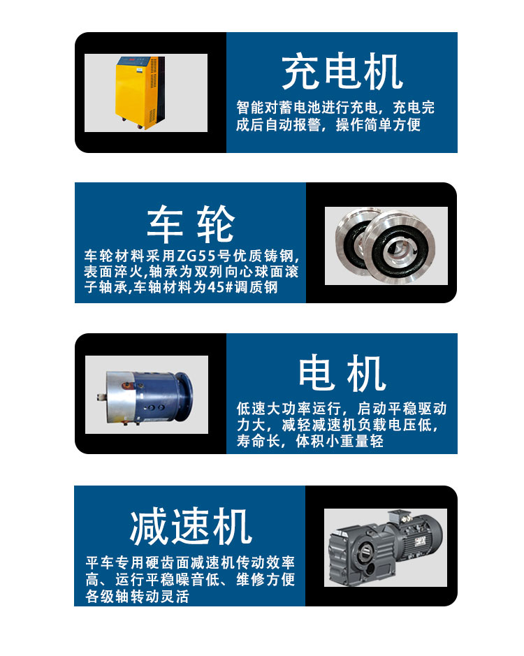 轨道式过跨电瓶车是一种以蓄电池作为电力来源的轨道平车,摆脱线缆的束缚,可采用遥控操作,使用时更加方便,适用于较长距离的轨道运输系统。应用范围:重工、轻工、机械、石油、冶金、矿山、化工、船舶等范围物料:钢卷、铝卷、镀锌卷、变压器、电缆盘、铸造件、电机、集装箱、车厢 、容器罐、压力容器等BXC系列蓄电池供电平车, 是由蓄电池提供电源的轨道平车, 蓄电池安装在平车内部, 电源通过电气控制系统, 给直流牵引电机提供电力;使平车启动,停止, 前进,后退,调速等。