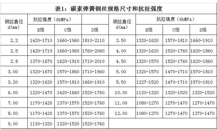 1、产品所选材料按GB4357和GB/T5218执行,弹簧钢丝的抗拉强度及直径公差应符合“表1”
