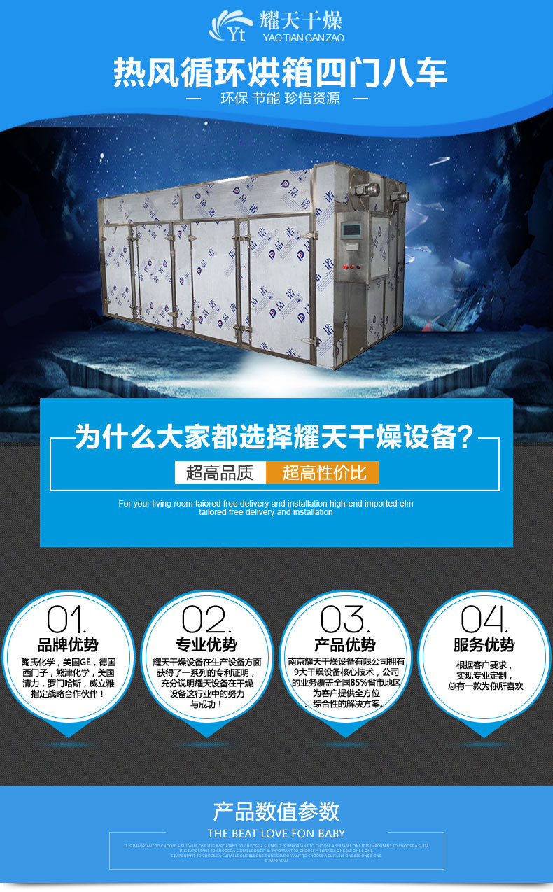 公司位于经济繁荣的古城——江苏南京,有着得天独厚的地理环境,区位优越,交通便捷。 本公司汇集了一批高层次、高素质的专业人才,采用了先进的经营管理方法,建立了完整的质量保证体系。且有着先进的产品试验设备、检验仪器和加工设备,拥有优良的产品开发环境和产品生产线。 我厂具有丰富的干燥设备设计、制造经验,生产的各种干燥设备已经广泛应用于制药、化工、电子、热处理、工业电炉、食品机械、农副产品加工等多种领域,产品畅销全国。 专业、信赖和责任,与我们永远在一起,耀天干燥设有限公司备厂永远是您的朋友,为您提供符合“GMP”要求的产品。耀天干燥设备有限公司竭诚欢迎各界朋友莅临指导,携手合作,共同创造更加辉煌的明天!