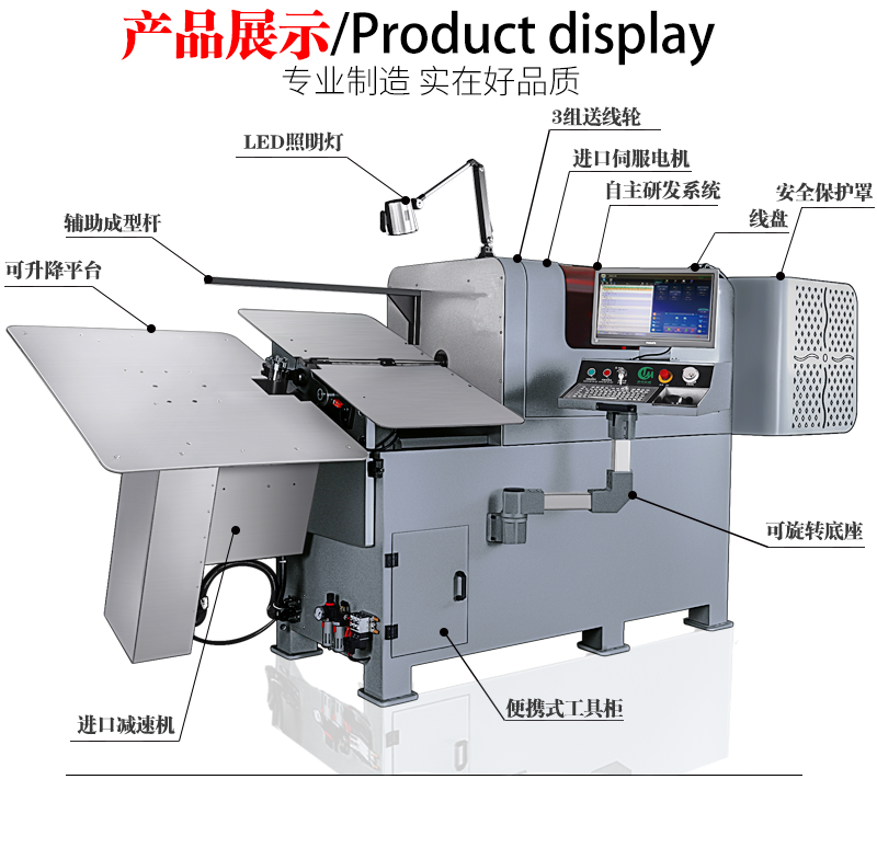 本机采用的无凸轮和无摇臂设计,由多组伺服马达独立控制,可以生产各种各样异型弹簧、压簧、拉簧、双扭簧、涡卷簧、扁簧(发条簧)汽车配件,汽车弹簧,家具五金,卫浴线材成型及复杂线材成型等。精密准确、调机快速、稳定可靠。