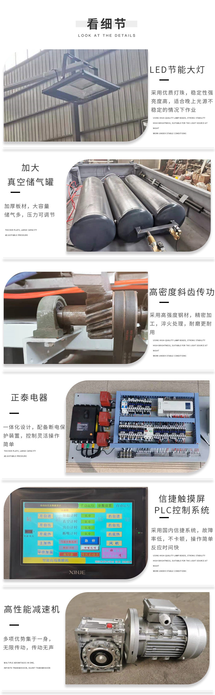 2、稳定真空泵,真空控制气压,使用电接真空表,自动控制真空气压。采用真空技术双走气道,走气性能稳定,工件成品率高。