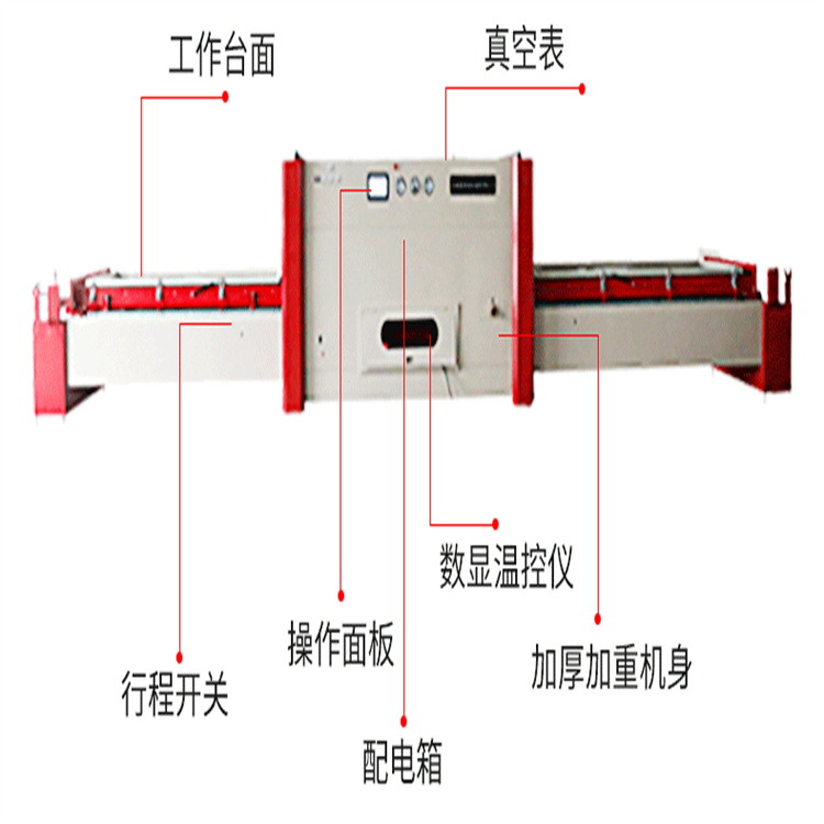 3、工作台采用框式钢架结构,提高真空度。交换式工作台 可进行一箱多件贴面,实现一机多用。机身工作台面采用强度钢板,在高温运行时不会变形。