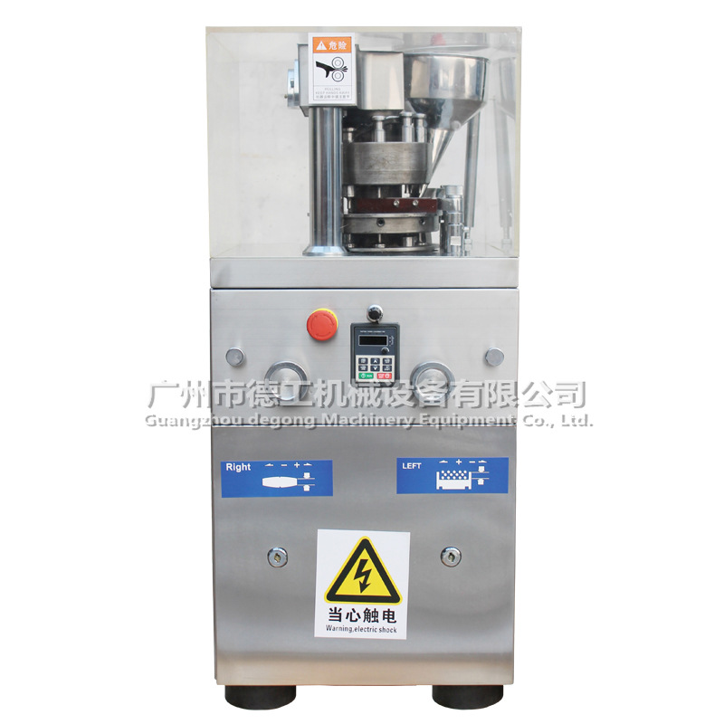 主要用途 本机是一种单压式自动旋转,连续压片的机器,将颗粒状原料压制成各种片剂。主要用于制药行业的片剂生产,同时适用于化工、食品、电子等工业部门。 机器外围罩壳为全密闭形式,材料采用不锈钢,内部台面用不锈钢材料,转台表面经过特殊处理,能保持表面光泽于防止交叉污染,符合GMP要求。装有透明玻璃的门窗,能清楚观察压片的状态,并且能取下,易于内部清理和保养。 所有控制器和操作件均合理布局,采用变频器调速装置进行电气调速,操作方便,转动平稳,完全准确。所有的传动装置均布置在机器内部,保持机件清洁。配有过载保护装置,当压力过载时,能自动停机,本机配有电磁制动电动机和其他安全保护装置,运行时也能调整于操作。