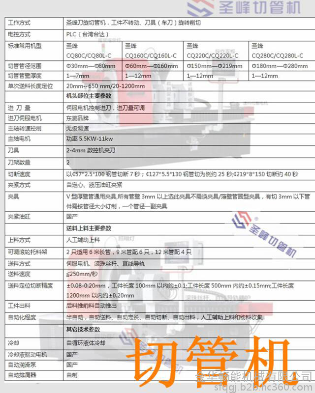 圣峰切管机,采用旋转刀(车刀或无屑割刀)的方式切管,切管时工件不转动,刀具旋转(反车式),采用PLC控制技术,是一款自动切管设备,因为设备具有切割速度快,精度高,刀具省,劳动强度低等特点,已在多个行业广泛应用。